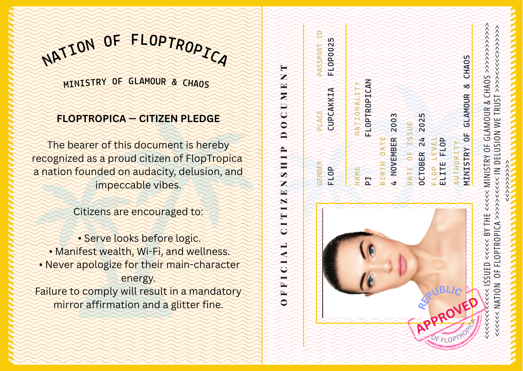 Your official entry clearance to the Republic of FlopTropica — stamped with glamour, chaos, and SPF-proof confidence. Personalize it with your name, photo and flop level.